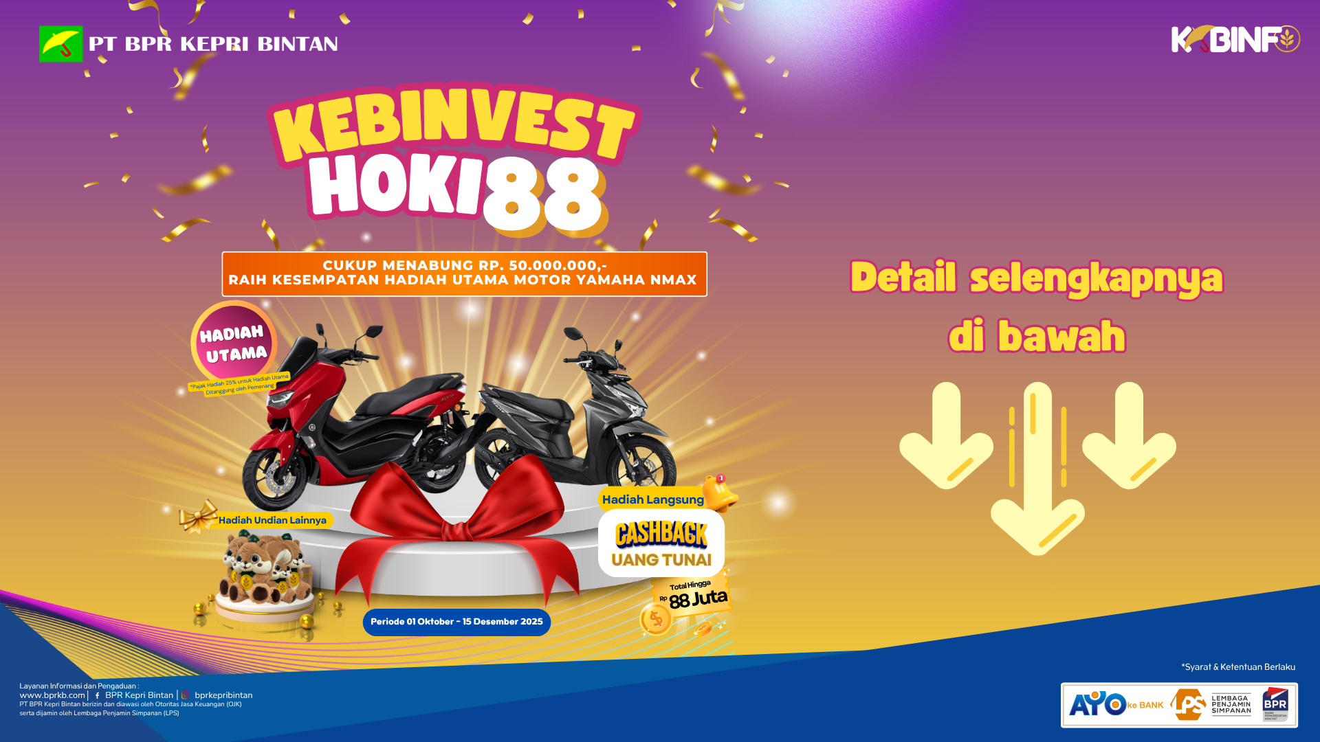 Keuntungan mengikuti KEBINVEST HOKI 88 Setiap peserta akan mendapatkan Cashback langsung senilai Rp 880.000 ke Rekening Tabungan Kepri Hoki 88! Memiliki Kesempatan untuk memenangkan hadiah utama berupa Motor Berkesempatan mendapatkan hadiah lainnya berupa mascot Savvy DAFTAR SEKARANG 1. Buka Tabungan Kepri Hoki 88 melalui Kantor Layanan terdekat 2. Menyetujui Syarat & ketentuan terkait Program Kebinvest Hoki 88 3. Menunggu tanggal undi (19 Desember 2025) Atau Hubungi Kami Melalui Pintasan di Bawah